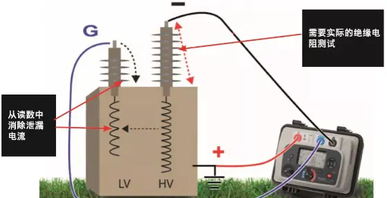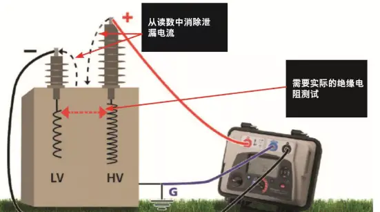 上图:使用屏蔽接口在没有高压和低压绕组之间的泄漏电流的影响之下,对高压绕组进行测试。