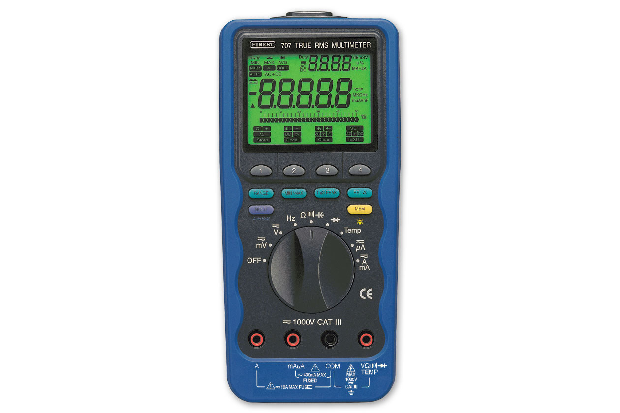 FINEST-F707是世界级的万用表,采用当今韩国尖端的电子科技,具有速度快、准确度高的特点,有温度测量、数据存储及连接电脑的功能,F707代表了韩国手持式万用表制造的最高水准。